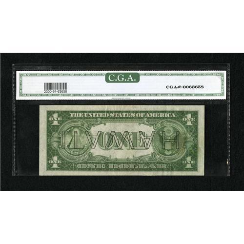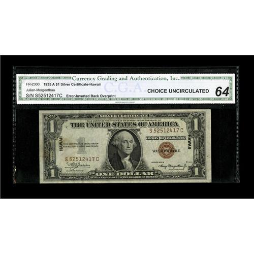 <B>Fr. 2300 $1 1935A Hawaii Silver Certificate. CGA Choice Uncirculated 64.</B></I><BR>This $1 has an inverted back "Hawaii" overprint. Always a striking error.<BR><BR><b>Shipping:</b> Coin/Currency (<a target="_blank" href="http://www.heritageauctions.com/common/shipping.php">view shipping information</a>)