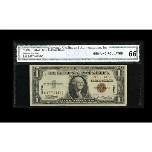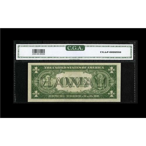 <B>Fr. 2300 $1 1935A Hawaii Silver Certificate. CGA Gem Uncirculated 66.</B></I><BR>The margins are exceedingly big, and if the top were any bigger, this note would probably be a Superb Gem.