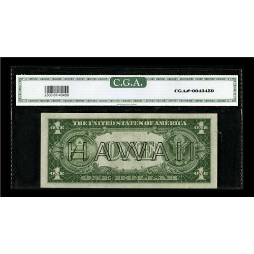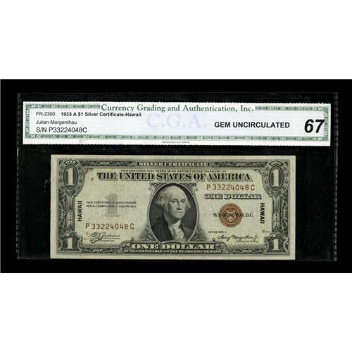 <B>Fr. 2300 $1 1935A Hawaii Silver Certificate. CGA Gem Uncirculated 67.</B></I><BR>Hulking margins and perfect centering are found on this lovely Hawaii Ace.<BR><BR><b>Shipping:</b> Coin/Currency (<a target="_blank" href="http://www.heritageauctions.com/common/shipping.php">view shipping information</a>)