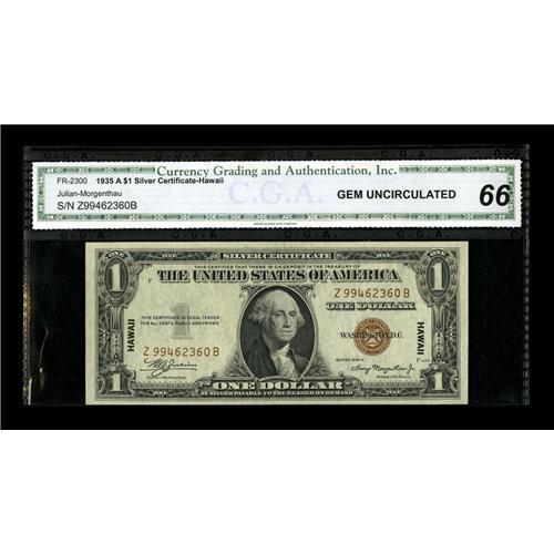 <B>Fr. 2300 $1 1935A Hawaii Silver Certificate. CGA Gem Uncirculated 66.</B></I><BR>This is a high quality and well embossed example of the very difficult Z-B block that for this cataloger's money is the greatest challenge to locate in the highest grades.<BR><BR><b>Shipping:</b> Coin/Currency (<a target="_blank" href="http://www.heritageauctions.com/common/shipping.php">view shipping information</a>)