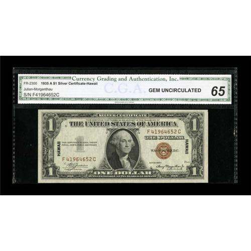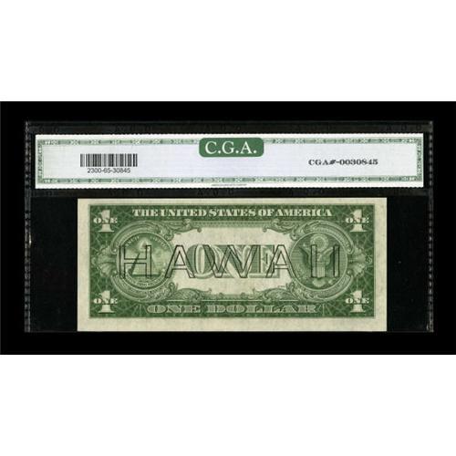 <B>Fr. 2300 $1 1935A Hawaii Silver Certificate. CGA Gem Uncirculated 65.</B></I><BR> This note from the elusive F-C block has plenty of eye appeal.<BR><BR><b>Shipping:</b> Coins & Currency (<a target="_blank" href="http://www.heritageauctions.com/common/shipping.php">view shipping information</a>)