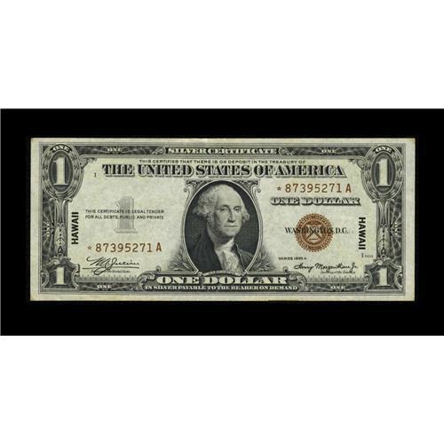 <B>Fr. 2300* $1 1935A Hawaii Silver Certificate. Extremely Fine.</B></I><BR>A pleasing and wholly original Star with only three folds.<BR><BR><b>Shipping:</b> Coin/Currency (<a target="_blank" href="http://www.heritageauctions.com/common/shipping.php">view shipping information</a>)