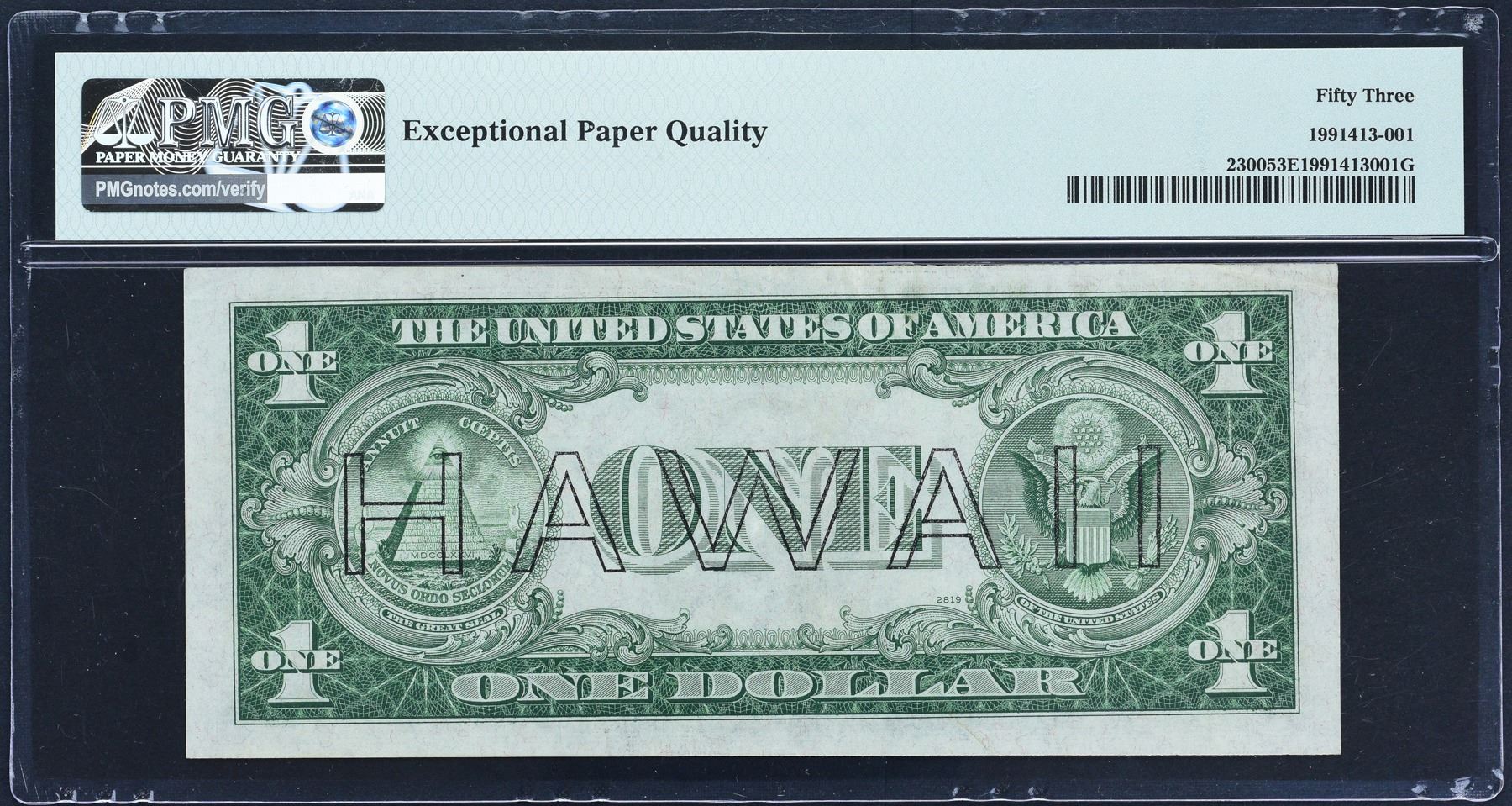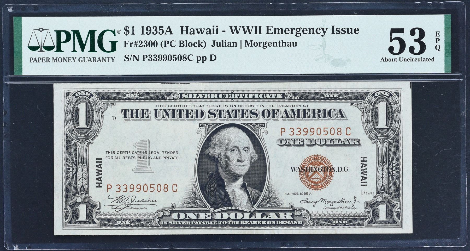 Title: Fr. 2300 $1 1935A Hawaii Silver Certificate PMG About Uncirculated 53 EPQ P-C Block