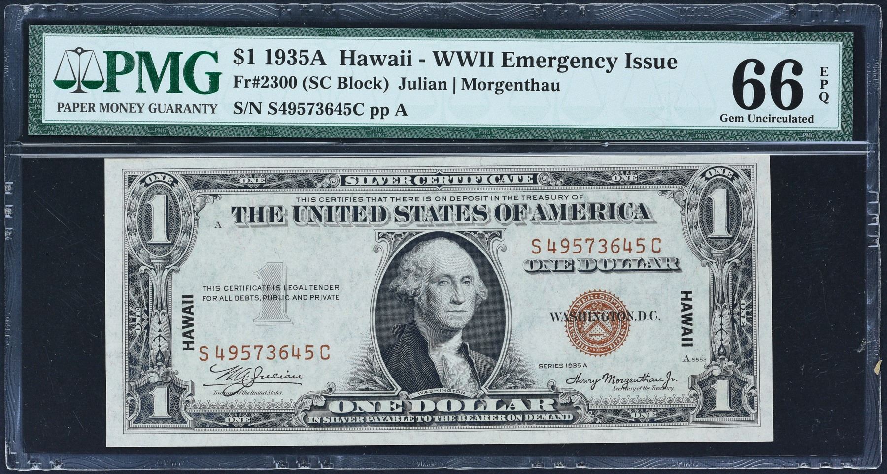 Title: Fr. 2300 $1 1935A Hawaii Silver Certificate PMG Gem Uncirculated 66 EPQ S-C Block