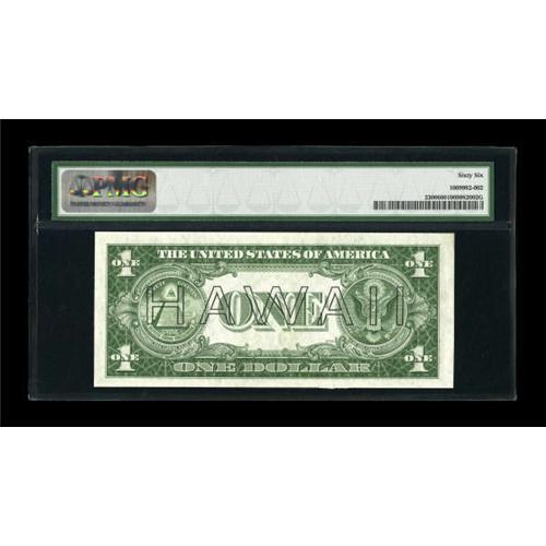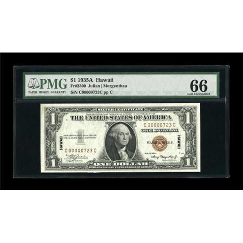 <B>Fr. 2300 $1 1935A Hawaii Silver Certificate. PMG Gem Uncirculated 66.</B></I><BR> A nicely centered PMG graded example bearing low serial number C00000723C.<BR><BR><b>Shipping:</b> Coins & Currency (<a target="_blank" href="http://www.heritageauctions.com/common/shipping.php">view shipping information</a>)