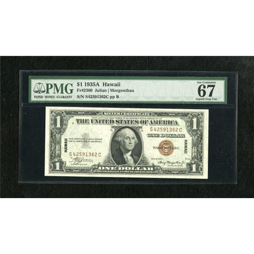 <B>Fr. 2300 $1 1935A Hawaii Silver Certificate. PMG Superb Gem Unc 67 EPQ.</B></I><BR> Behemoth margins and perfect centering are seen on this gorgeous Hawaii Ace.<BR><BR><b>Shipping:</b> Coins & Currency (<a target="_blank" href="http://www.heritageauctions.com/common/shipping.php">view shipping information</a>)