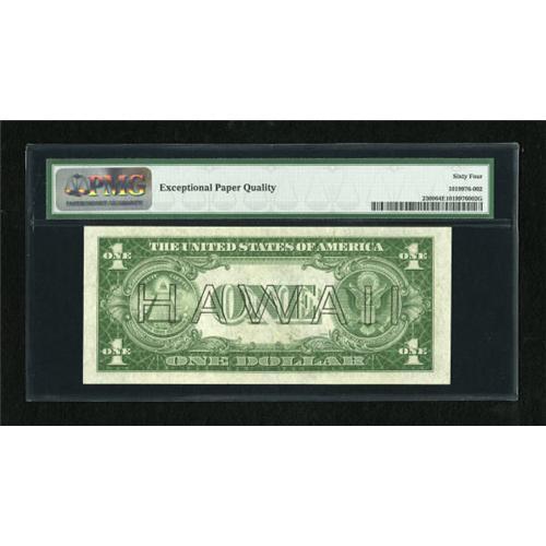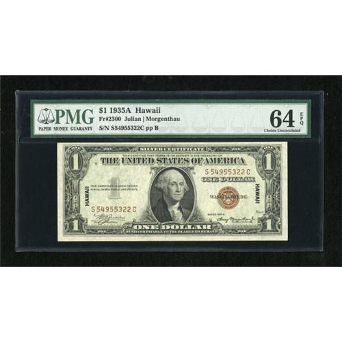 <B>Fr. 2300 $1 1935A Hawaii Silver Certificate. PMG Choice Uncirculated 64 EPQ.</B></I><BR> A very attractive Hawaii Ace that has three huge margins and an adequate fourth.<BR><BR><b>Shipping:</b> Coins & Currency (<a target="_blank" href="http://www.heritageauctions.com/common/shipping.php">view shipping information</a>)