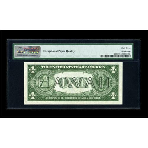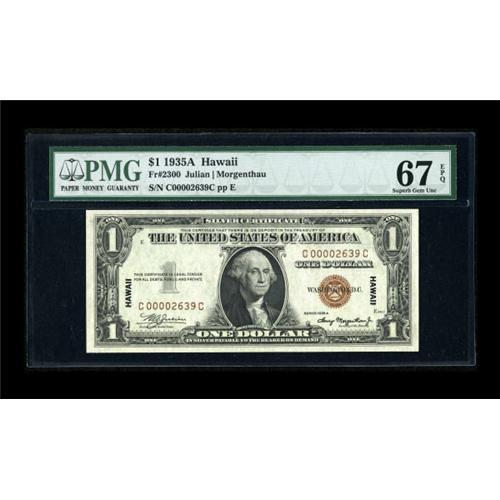 <B>Fr. 2300 $1 1935A Hawaii Silver Certificate. PMG Superb Gem Unc 67 EPQ.</B></I><BR> Serial number C00002639C graces this ideally original issue. It is one of five sequential notes in this auction, all Gem to Superb in quality and all beaming with originality.<BR><BR><b>Shipping:</b> Coins & Currency (<a target="_blank" href="http://www.heritageauctions.com/common/shipping.php">view shipping information</a>)