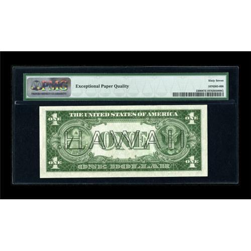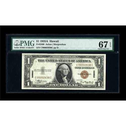<B>Fr. 2300 $1 1935A Hawaii Silver Certificate. PMG Superb Gem Unc 67 EPQ.</B></I><BR> Another example from the four digit serial numbered Hawaii Aces in this sale. This piece, along with one other are the two highest graded and it is no wonder why, as they drip with originality.<BR><BR><b>Shipping:</b> Coins & Currency (<a target="_blank" href="http://www.heritageauctions.com/common/shipping.php">view shipping information</a>)