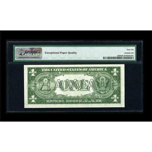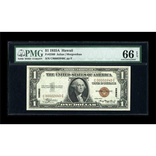 <B>Fr. 2300 $1 1935A Hawaii Silver Certificate. PMG Gem Uncirculated 66 EPQ.</B></I><BR> The C00002640C serial number is only a few serial numbers removed from the consecutive pair of the same grade in this auction. It is consecutive to the two 67's also offered here. This piece boasts the same unadulterated paper surfaces and bold embossing.<BR><BR><b>Shipping:</b> Coins & Currency (<a target="_blank" href="http://www.heritageauctions.com/common/shipping.php">view shipping information</a>)