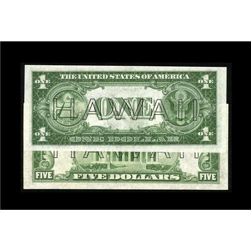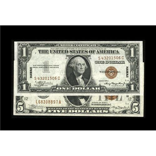 <B>Fr. 2300 $1 1935A Hawaii Silver Certificate and a Fr. 2302 $5 1934A Hawaii Federal Reserve Note.</B></I><BR>The ace is full <B>Gem Uncirculated</B></I> while the $5 grades <B>About Uncirculated.</B></I>