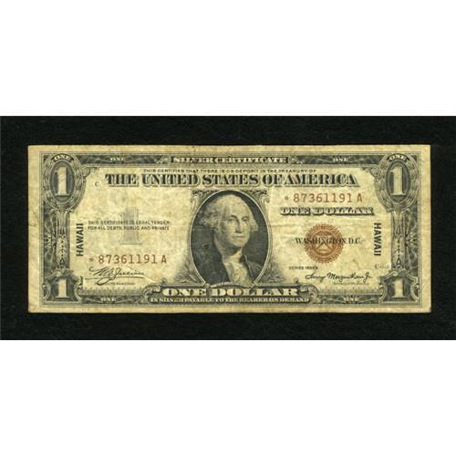 <B>Fr. 2300* $1 1935A Hawaii Silver Certificate. Very Good-Fine.</B></I><BR> A pleasing example of this emergency star that suffered the travails of circulation as there is a small tear covered on the back with clear tape<BR><BR><b>Shipping:</b> Coins & Currency (<a target="_blank" href="http://www.heritageauctions.com/common/shipping.php">view shipping information</a>)