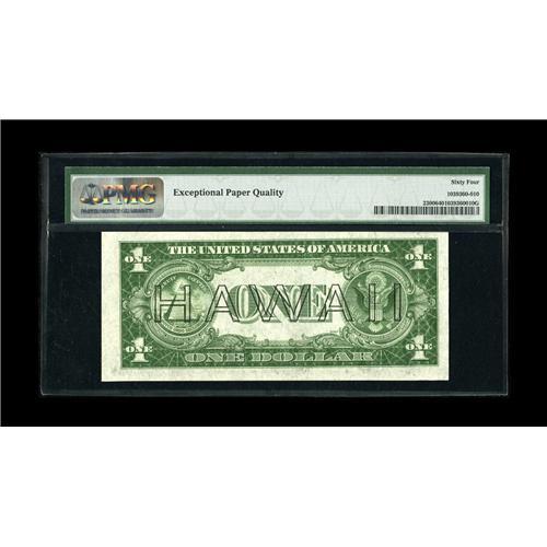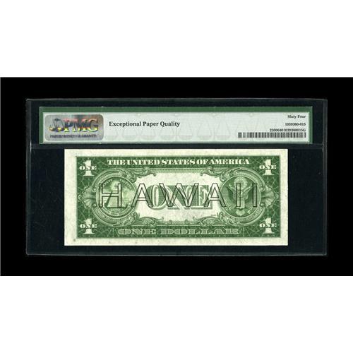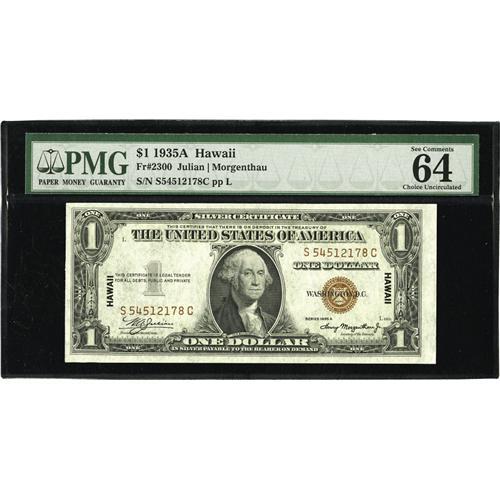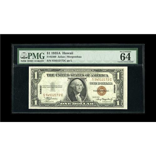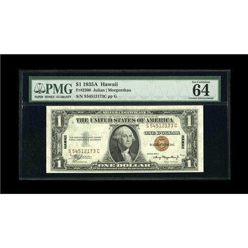<B>Fr. 2300 $1 1935A Hawaii Silver Certificates. Seven Consecutive Examples PMG Choice Uncirculated 64EPQ.</B></I><BR>One Choice 63 note is mixed into this run of pleasing Hawaiians. These notes are all crisp with noticeable natural surfaces.