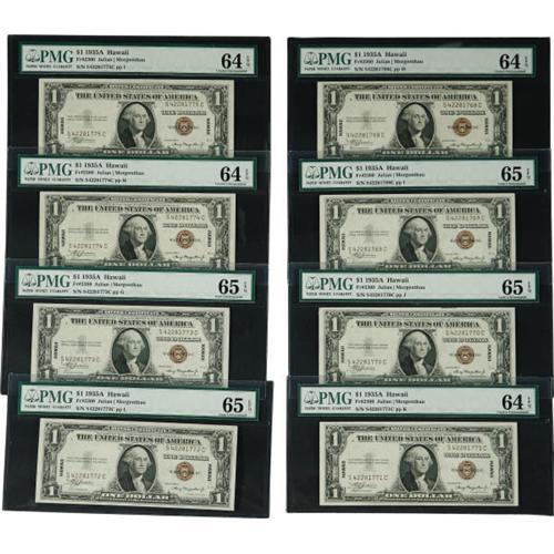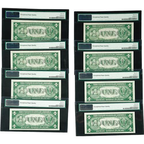 <B>Fr. 2300 $1 1935A Hawaii Silver Certificates. Eight Consecutive Examples. </B></I><BR> This consecutive run is split equally between 64 and 65 third-party graded notes. The first; fourth; seventh; and eighth notes grade <B>PMG Choice Uncirculated 64 EPQ </B></I>and the other four notes weigh in at <B>PMG Gem Uncirculated 65 EPQ. </B></I>All of the notes are beautiful with only a slight reduction in a top or bottom margin keeping those four notes from also being graded as Gem.<BR><BR><b>Shipping:</b> Coins & Currency (<a target="_blank" href="http://www.heritageauctions.com/common/shipping.php">view shipping information</a>)