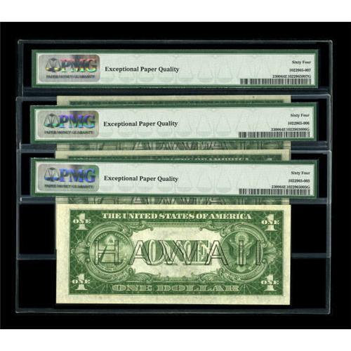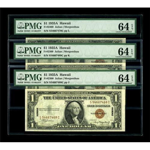 <B>Fr. 2300 $1 1935A Hawaii Silver Certificates. Three Consecutive Examples PMG Choice Uncirculated 64 EPQ.</B></I><BR> A corner tip fold is noticed on the last note in this otherwise pack fresh trio.<BR><BR><b>Shipping:</b> Coins & Currency (<a target="_blank" href="http://www.heritageauctions.com/common/shipping.php">view shipping information</a>)