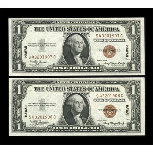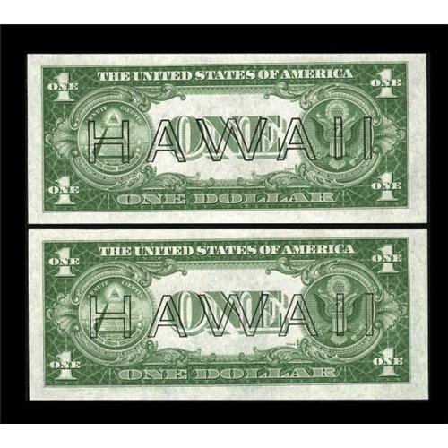 <B>Fr. 2300 $1 1935A Hawaii Silver Certificates. Two Consecutive Examples Choice Crisp Uncirculated.</B></I><BR> A lovely pair of pack fresh $1 Hawaii notes.<BR><BR><b>Shipping:</b> Coins & Currency (<a target="_blank" href="http://www.heritageauctions.com/common/shipping.php">view shipping information</a>)