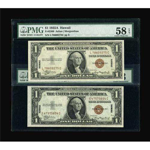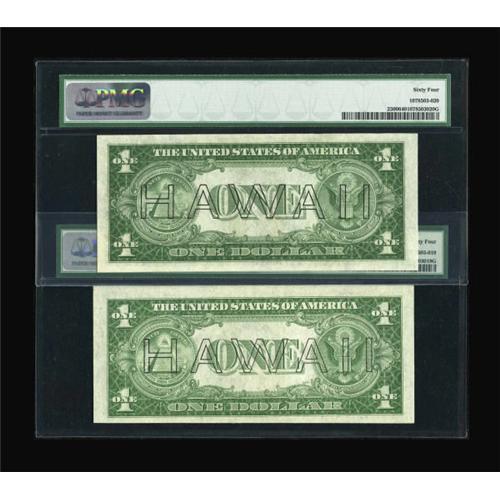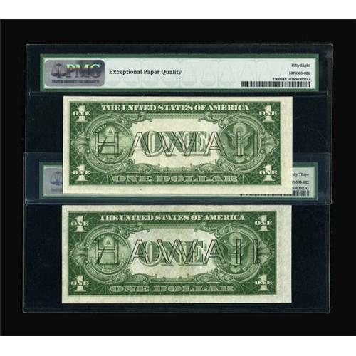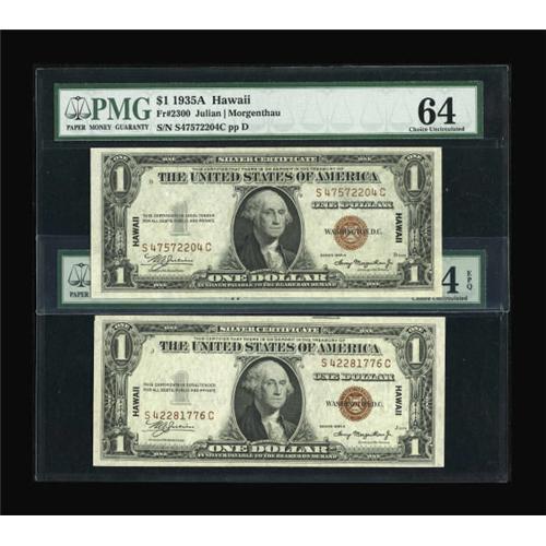 <B>Fr. 2300 $1 1935A Hawaii Silver Certificates. Four Examples.</B></I><BR> The four notes in this lot have grades <B>PMG Choice About Unc 58 EPQ; PMG Choice Uncirculated 63; PMG Choice Uncirculated 63 EPQ; and PMG Choice Uncirculated 64.</B></I><BR><BR><b>Shipping:</b> Coins & Currency (<a target="_blank" href="http://www.heritageauctions.com/common/shipping.php">view shipping information</a>)