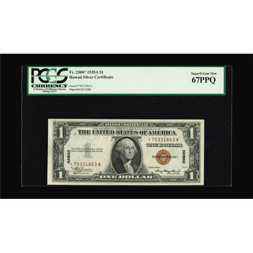 <B>Fr. 2300* $1 1935A Hawaii Star Silver Certificate. PCGS Superb Gem New 67PPQ.</B></I><BR>We sold a PMG 66 for a hammer price of $3,500 this past January, so, how much higher will this note go?