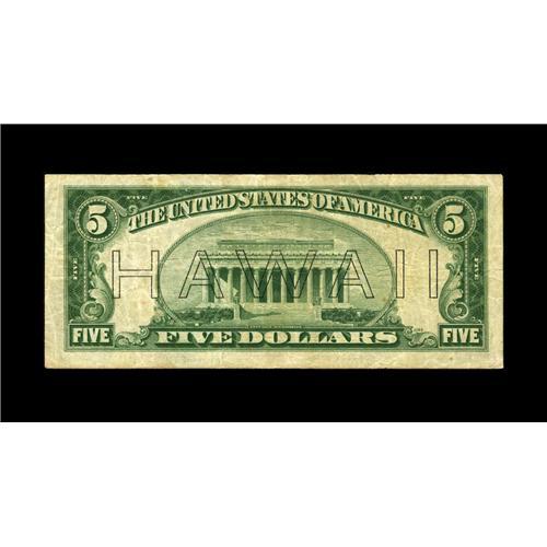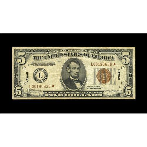<B>Fr. 2301* $5 1934 Hawaii Federal Reserve Note. Fine.</B></I><BR>This Mule carries the highest serial number listed in the Oakes reference for this Friedberg number.<BR><I>From The Bill and Kathy Stella Currency Collection</B></I><BR><BR><b>Shipping:</b> Coin/Currency (<a target="_blank" href="http://www.heritageauctions.com/common/shipping.php">view shipping information</a>)