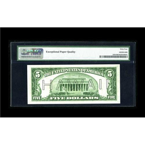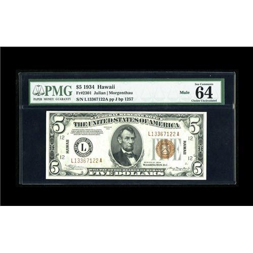 <B>Fr. 2301 $5 1934 Hawaii Federal Reserve Note. PMG Choice Uncirculated 64EPQ.</B></I><BR>A pack fresh note that likely would have earned a higher certification with just a hint more margin at top. It remains superior in overall eye appeal to many of the examples on the marketplace today being offered as Gems.<BR><BR><b>Shipping:</b> Coin/Currency (<a target="_blank" href="http://www.heritageauctions.com/common/shipping.php">view shipping information</a>)