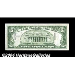 Fr. 2301 $5 1934 Hawaii Federal Reserve Note. About Uncirculated.The scarce non-Mule variety, a tough note to find in this state of preservation. <BR><BR><B>Important notice:</B> Heritage usually auctions material at the rate of 200-250 lots per hour. On some occasions eBay Live bid software or the Internet may not be able to keep up with the pace of the auction. We recommend placing a realistic absentee bid now as insurance to avoid disappointment. Occasionally the auctioneer may eliminate or reject an eBay Live bid, and the auctioneer may also reopen a lot after the close of the eBay live bidding (usually because we missed an audience bid), and may reject your bid even if it shows you as the winning bidder. By bidding via eBay Live, you agree that Heritage may award the lot to another bidder at its sole discretion under the circumstances described above or any other reasonable circumstances. Since eBay bids are not shown to us until we open the lot on the floor, we treat those bids just like floor bids. In most cases the floor responds before the eBay bid is presented to us, due to Internet lag time, so for consistency we have made it a policy that floor bids are always considered first over tie eBay live bids. Also please note that all Heritage lots purchased through eBay Live carry a 20% Buyer's Premium. Please make sure you read the Terms and Conditions before you bid. <BR><BR><B>IMPORTANT ANNOUNCEMENT ABOUT RESERVES:</B> Heritage now divulges all reserves on its web site 7 days before every auction. If you want to know whether the reserve on this lot has been met, and if not, what the reserve amount is, please visit this lot page on the HeritageCoin.com web site, or email: bid@HeritageGalleries.com