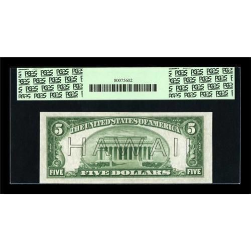 <B>Fr. 2301 $5 1934 Non-Mule Hawaii Federal Reserve Note. PCGS Very Choice New 64.</B></I><BR> Gem quality margins are noted on this scarcer Non-Mule issue. The paper and overprint are as bright as one will find for the issue.<BR><BR><b>Shipping:</b> Coins & Currency (<a target="_blank" href="http://www.heritageauctions.com/common/shipping.php">view shipping information</a>)