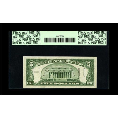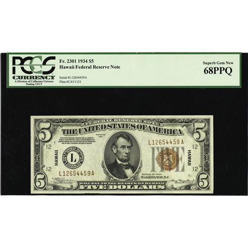 <B>Fr. 2301 $5 1934 Mule Hawaii Federal Reserve Note. PCGS Superb Gem New 68PPQ.</B></I><BR>Without question one of the finest notes of this type we have ever handled. The paper surfaces are brimming with freshness and the color is quite intense. This becomes the lowest serial number seen in the Oakes reference. It will be interesting to see what the ultimate price is for this beauty.