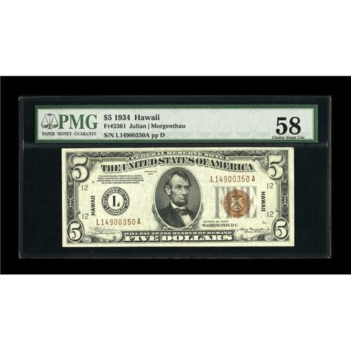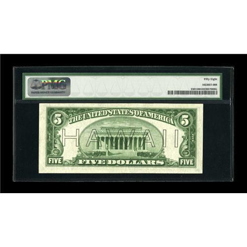 <B>Fr. 2301 $5 1934 Mule Hawaii Federal Reserve Note. PMG Choice About Unc 58.</B></I><BR>Bright paper and deep inks are seen on this example which there never seem to be enough of.<BR><BR><b>Shipping:</b> Coins & Currency (<a target="_blank" href="http://www.heritageauctions.com/common/shipping.php">view shipping information</a>)