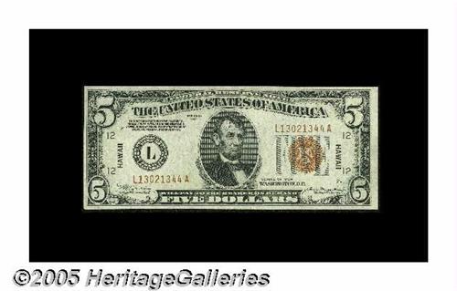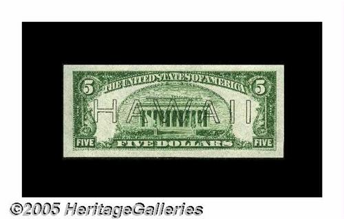 <B>Fr. 2301 $5 1934 Mule Hawaii Federal Reserve Note. Choice Crisp Uncirculated.</B></I><BR>A problem-free Hawaii.