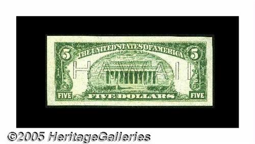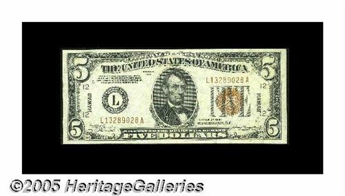 <B>Fr. 2301 $5 1934 Mule Hawaii Federal Reserve Note. Choice Crisp Uncirculated.</B></I><BR>Well-centered and would come tantalizingly close to Gem but for an as-made paper wrinkle at right.