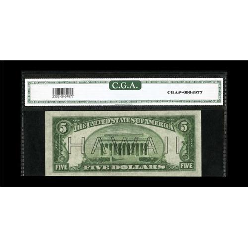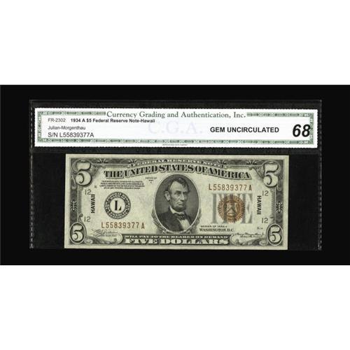 <B>Fr. 2302 $5 1934A Hawaii Federal Reserve Note. CGA Gem Uncirculated 68.</B></I><BR>From last year's Long Beach show, where we described, "For those wanting to build a finest known set, this Hawaiian will be a welcome addition. Boardwalk margins and perfect centering showcase this CGA Gem Uncirculated 68 note."