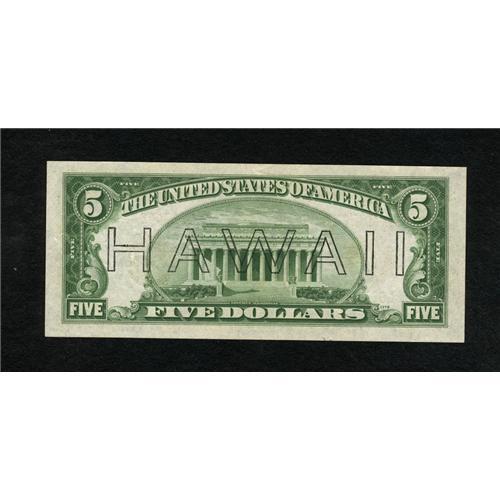 <B>Fr. 2302 $5 1934A Hawaii Federal Reserve Note. Choice About Uncirculated.</B></I><BR>A virtually imperceptible centerfold is found on this otherwise crisp and original Hawaii Five.<BR><BR><b>Shipping:</b> Coins & Currency (<a target="_blank" href="http://www.heritageauctions.com/common/shipping.php">view shipping information</a>)