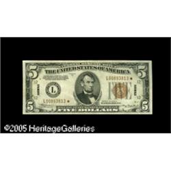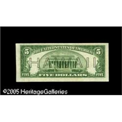 <B>Fr. 2302* $5 1934A Hawaii Federal Reserve Note. Extremely Fine-About Uncirculated.</B></I><BR>This is one of the great star note rarities in any grade, with this piece the nicest that our consignor could obtain in several years of searching. It appears uncirculated at first glance, but close examination shows it has had a few light folds deftly removed to make it appear new. The Oakes catalogue values this star at $6500 in VF and $17,500 in CU, and this example will likely see bidding end right in the middle of that range tonight. Lot:16640