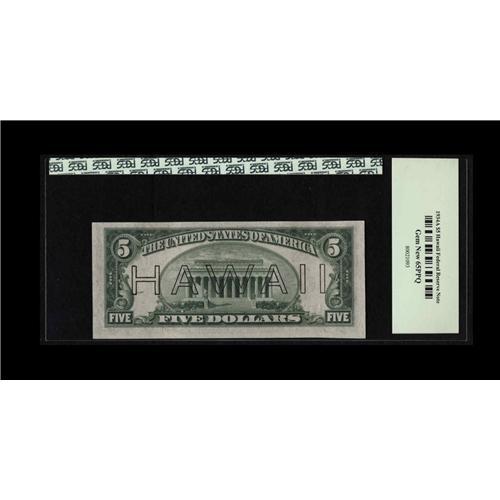 <B>Fr. 2302 $5 1934A Hawaii Federal Reserve Note. PCGS Gem New 65PPQ.</B></I><BR>This grade is quite elusive for this series. Strong embossing and bold overprints highlight this note.