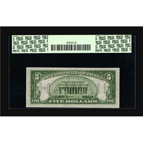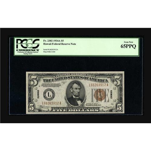 <B>Fr. 2302 $5 1934A Hawaii Federal Reserve Note. PCGS Gem New 65PPQ.</B></I><BR>Simply a gorgeous Hawaiian with powerful embossing and even margins all the way around. A grade of which there never seem to be enough to go around.<BR><I>From The George P. Hammerly Collection</B></I><BR><BR><b>Shipping:</b> Coin/Currency (<a target="_blank" href="http://www.heritageauctions.com/common/shipping.php">view shipping information</a>)