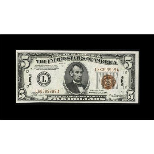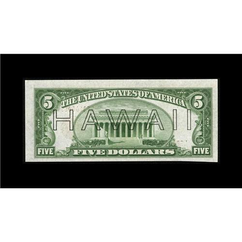 <B>Fr. 2302 $5 1934A Hawaii Federal Reserve Note. Very Choice Crisp Uncirculated.</B></I><BR>A lovely note with great color and full embossing. If the centering were just a touch better this would easily make the gem grade.