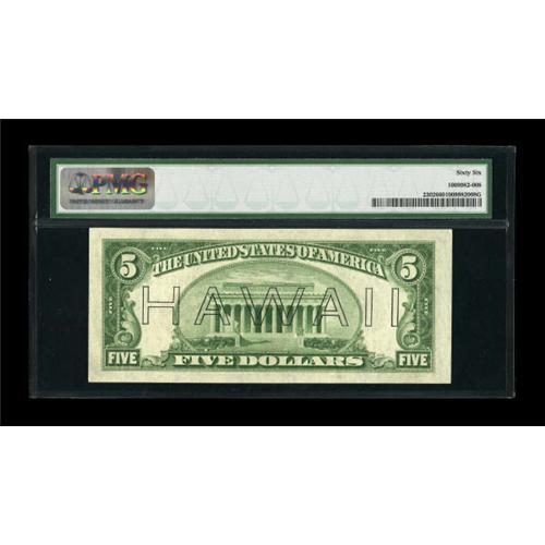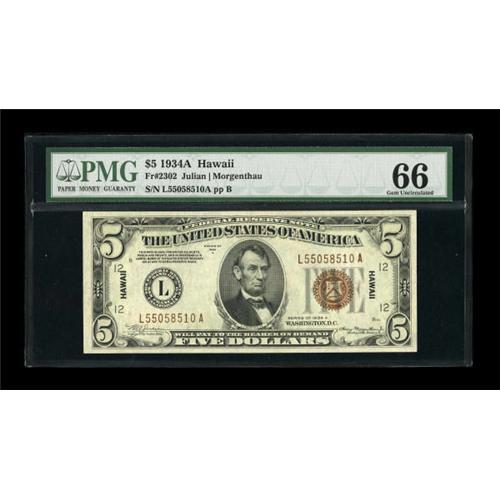 <B>Fr. 2302 $5 1934A Hawaii Federal Reserve Note. PMG Gem Uncirculated 66.</B></I><BR> A beautifully centered example encapsulated in a PMG Gem Uncirculated 66 holder. <BR><BR><b>Shipping:</b> Coins & Currency (<a target="_blank" href="http://www.heritageauctions.com/common/shipping.php">view shipping information</a>)