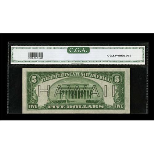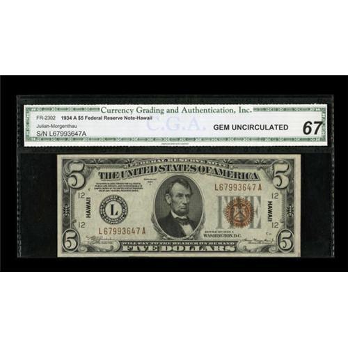 <B>Fr. 2302 $5 1934A Hawaii Federal Reserve Note. CGA Gem Uncirculated 67.</B></I><BR> A bit of toning is noticed on this pleasing WWII that is nicely centered.<BR><BR><b>Shipping:</b> Coins & Currency (<a target="_blank" href="http://www.heritageauctions.com/common/shipping.php">view shipping information</a>)