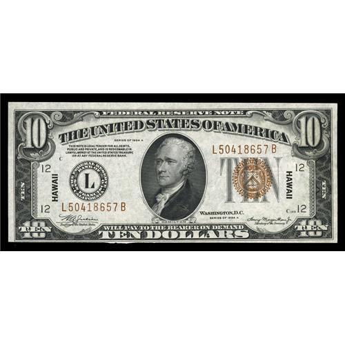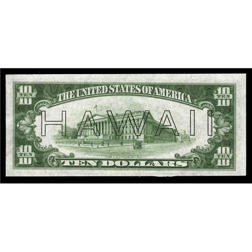 <B>Fr. 2303 $10 1934A Hawaii Federal Reserve Note. Choice Crisp Uncirculated.</B></I><BR>A touch of handling and a narrow lower margin account for the grade on this unmolested Emergency Issue.