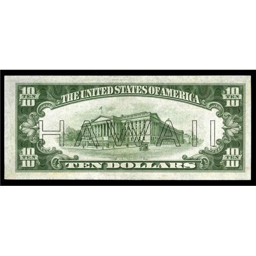 <B>Fr. 2303 $10 1934A Hawaii Federal Reserve Note. Choice About Uncirculated.</B></I><BR>This eye catching Hawaii has the look of an Gem note, though there is a bit of handling in the center that precludes us from calling it CU.