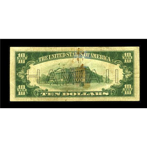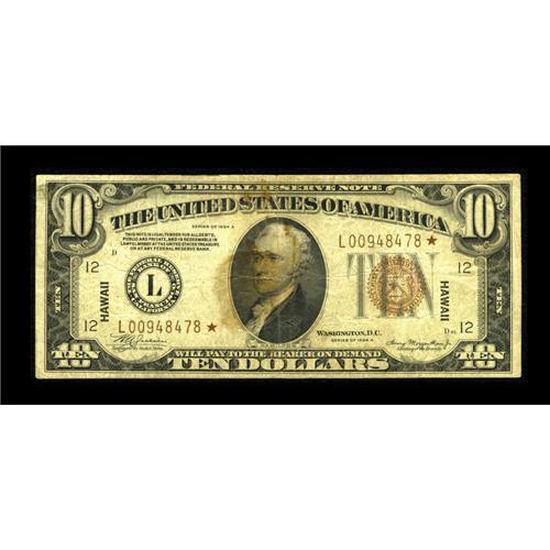 <B>Fr. 2303* $10 1934A Hawaii Federal Reserve Note. Fine.</B></I><BR>A very scarce star which had a printing of only 108,000 pieces. There is a paper clip mark on the reverse, and some staining which affects the front of the note as well.<BR><BR><b>Shipping:</b> Coins & Currency (<a target="_blank" href="http://www.heritageauctions.com/common/shipping.php">view shipping information</a>)