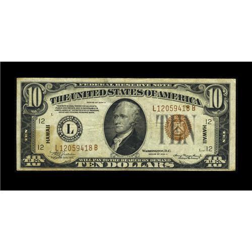 <B>Fr. 2303 $10 1934A Hawaii Federal Reserve Note. Fine-Very Fine.</B></I><BR>This is a major Hawaii error rarity as this note lacks the black "Hawaii" overprint on the back. The note does have staining.<BR><BR><b>Shipping:</b> Coin/Currency (<a target="_blank" href="http://www.heritageauctions.com/common/shipping.php">view shipping information</a>)