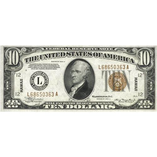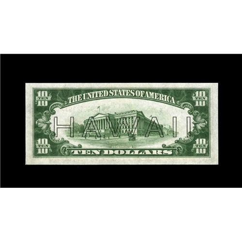 <B>Fr. 2303 $10 1934A Hawaii Federal Reserve Note. Gem Crisp Uncirculated.</B></I><BR>This is a gorgeous Hawaii Ten which is a fully original piece displaying great paper originality, loads of embossing, and vivid colors. The centering, while not letter perfect, is still more than adequate on both the front and back to easily merit the Gem grade.