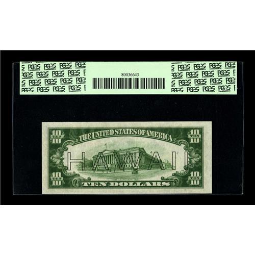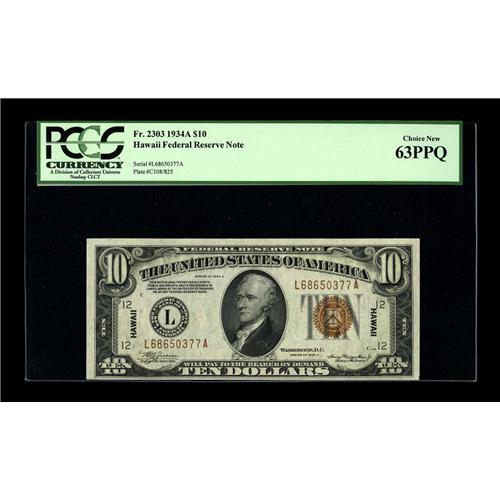 <B>Fr. 2303 $10 1934A Hawaii Federal Reserve Note. PCGS Choice New 63PPQ.</B></I><BR>Perfectly original paper is easily seen through the third party holder. The bold embossing of even the Letters of HAWAII is also clearly visible. The grade limiting factor may only be the uneven centering.<BR><I>From The Bill and Kathy Stella Currency Collection</B></I><BR><BR><b>Shipping:</b> Coin/Currency (<a target="_blank" href="http://www.heritageauctions.com/common/shipping.php">view shipping information</a>)