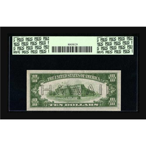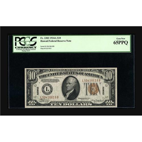 <B>Fr. 2303 $10 1934A Hawaii Federal Reserve Note. PCGS Gem New 65PPQ.</B></I><BR>A wonderful representative which is totally original in every respect with bright colors, monstrous embossing, and plentiful margins. Decent centering rounds out the superlatives one would use to describe this lovely piece.<BR><I>From The George P. Hammerly Collection</B></I><BR><BR><b>Shipping:</b> Coin/Currency (<a target="_blank" href="http://www.heritageauctions.com/common/shipping.php">view shipping information</a>)