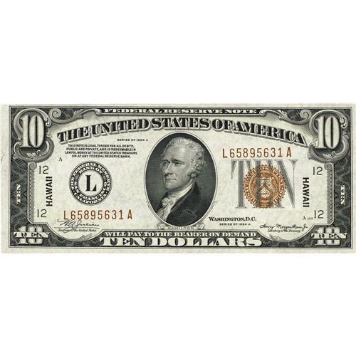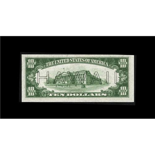 <B>Fr. 2303 $10 1934A Hawaii Federal Reserve Note. Very Choice Crisp Uncirculated.</B></I><BR>This pleasing and original note is a hair tight at top to command a Gem grade. The paper and embossing are both ideal.