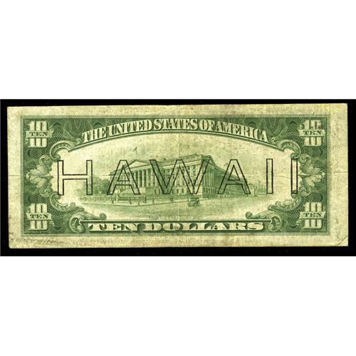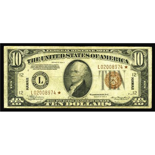 <B>Fr. 2303* $10 1934A Hawaii Federal Reserve Note. Fine.</B></I><BR>Sound edges for the grade and a bit of paper snap highlight this tough Star. This example is from near the beginning of the second printing of only 4000 notes. This is by far the scarcest printing of the three involved with printing this replacement note.