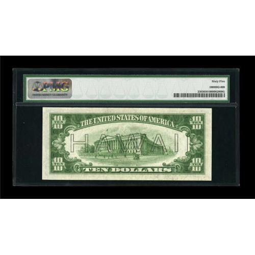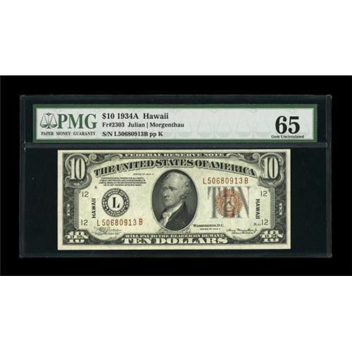 <B>Fr. 2303 $10 1934A Hawaii Federal Reserve Note. PMG Gem Uncirculated 65.</B></I><BR> A bright and well margined piece which appears fully deserving of PMG's Gem Uncirculated 65 grade. <BR><BR><b>Shipping:</b> Coins & Currency (<a target="_blank" href="http://www.heritageauctions.com/common/shipping.php">view shipping information</a>)
