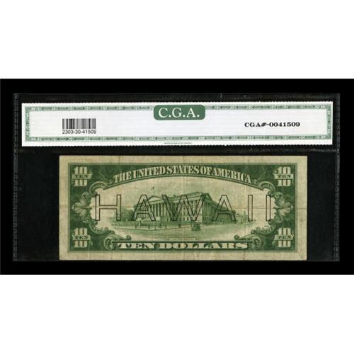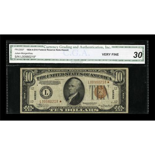 <B>Fr. 2303* $10 1934A Hawaii Federal Reserve Note. CGA Very Fine 30.</B></I><BR> A problem free Hawaii Star with few folds for the grade. Hawaii $10 Stars were printed in three print runs, this from the first run of 96,000 notes running from serial number L00900001* to L00996000*.<BR><BR><b>Shipping:</b> Coins & Currency (<a target="_blank" href="http://www.heritageauctions.com/common/shipping.php">view shipping information</a>)