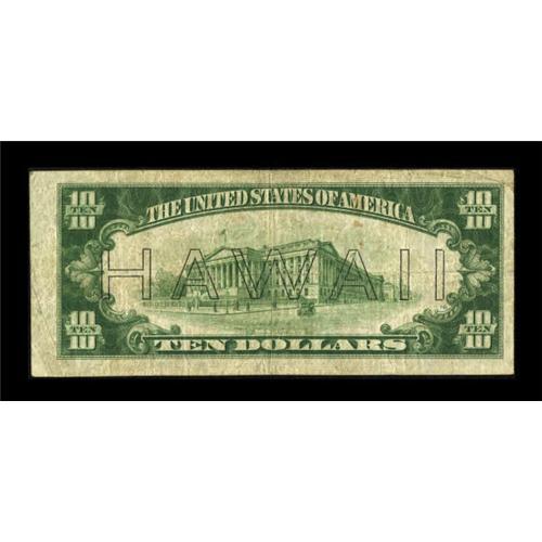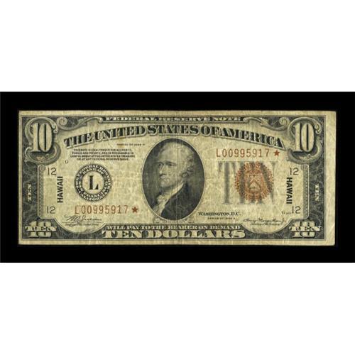 <B>Fr. 2303* $10 1934A Hawaii Federal Reserve Note. Fine.</B></I><BR> A very scarce star which had a printing of only 108,000 pieces with this note being from the largest of the three runs printed. The paper remains firm despite the circulation sustained. <BR><BR><b>Shipping:</b> Coins & Currency (<a target="_blank" href="http://www.heritageauctions.com/common/shipping.php">view shipping information</a>)